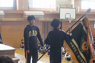 6年生から5年生へ団旗やバンドが引き渡されました。